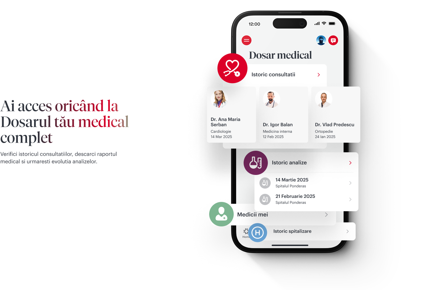 Verifici istoricul consultatiilor, descarci raportul medical si urmaresti evolutia analizelor.