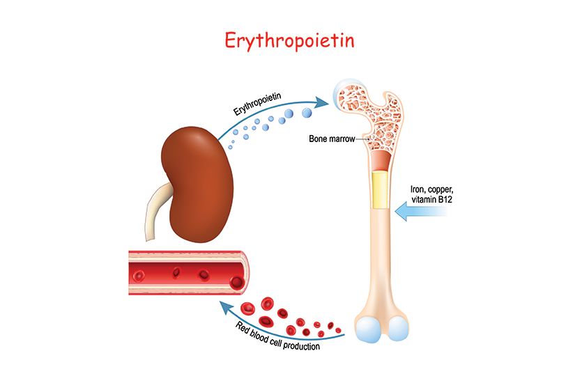 Rata de producere a eritrocitelor este controlata de hormonul eritropoietina, care este produs in mare parte in rinichi. Mecanismul eritropoietinei functioneaza ca un termostat, crescand sau scazand rata productiei de celule rosii in functie de nevoie. Eritropoietina a fost produsa in vitro (in afara corpului) prin tehnica ingineriei genetice (ADN recombinant). Hormonul recombinant purificat este promitator pentru pacientii cu insuficienta renala cronica, care dezvolta anemie din cauza lipsei de eritropoietina.