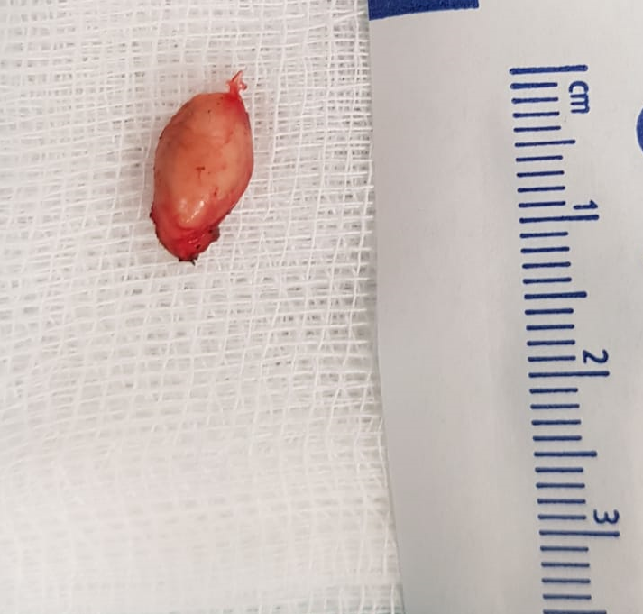 Interventia a necesitat doar cateva ore de spitalizare, abordarea operatorie a respectat principiile sigurantei si principiile de estetica, astfel incat cicatricea postoperatorie sa fie minima si cat mai putin vizibila, iar bebelusul si parintii sai au putut sa plece acasa in aceeasi zi. Examenul anatomo-patologic a confirmat diagnosticul preoperator.