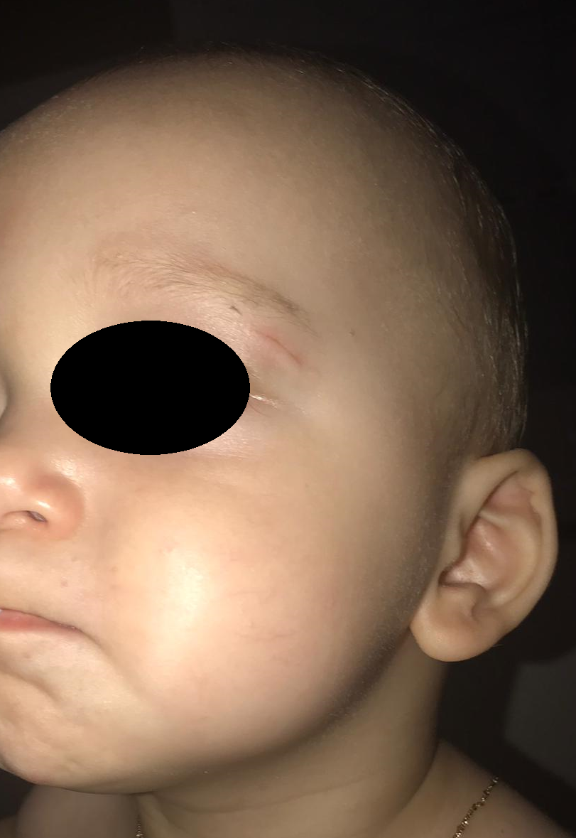 Chistul – o formatiune tumorala de aproximativ 1 cm lungime, situata in treimea externa a sprancenei stangi a fost descoperit la nastere, dar odata cu cresterea nou-nascutului, a crescut in dimensiuni si chistul. Localizarea particulara a chistului si cresterea in dimensiuni au determinat caderea pleoapei (ptoza palpebrala), ducand la dificultati de vedere. Pe termen lung, exista pericolul afectarii vederii copilului, de aceea decizia a fost de indepartare chirurgicala a chistului.