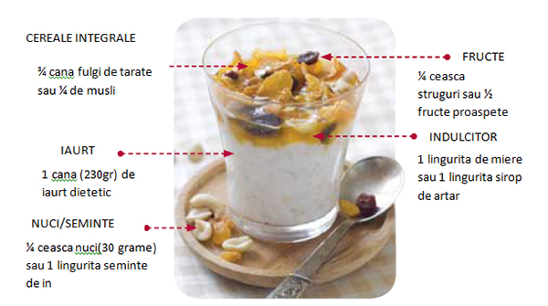 Fructe si iaurt : O cana de iaurt simplu dietetic, o mana medie de fructe proaspete sau uscate, stropite cu nuci, musli, tarate sau ovaz este tot ce ai nevoie. Indulceste dupa gust cu miere, sirop de artar sau zahar obisnuit.