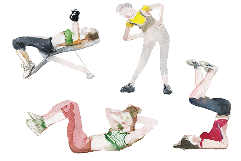 - Podul: Stai culcat pe spate, cu genunchii indoiti si cu talpile lipite de podea. Pune mainile langa solduri, cu palmele pe podea. Mentinand spatele drept, ridica fesele cat mai mult posibil de pe saltea. Fa o pauza. Coboara incet.