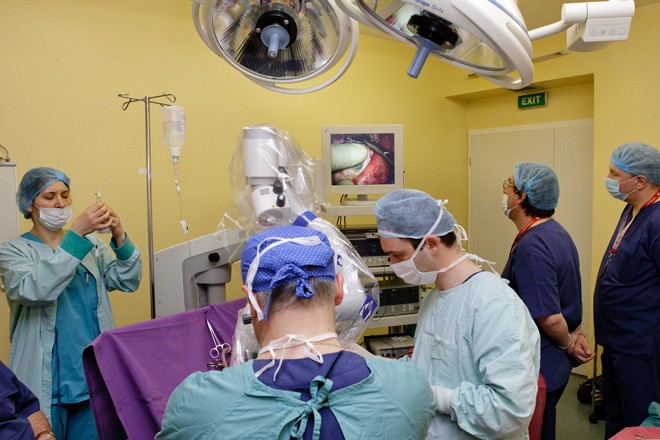 Chirurgia implantului cohlear se efectuează sub anestezie generală. Chirurgul practică o incizie în osul din spatele urechii pe care se plasează stimulatorul. Electrodul ajunge în urechea internă, sediul auzului, în cohlee. Funcţionalitatea implantului este testată în timpul operaţiei cu ajutorul unui dispozitiv electronic, însă dispozitivul va fi activat după una-două luni când micul pacient va începe programul de logopedie.