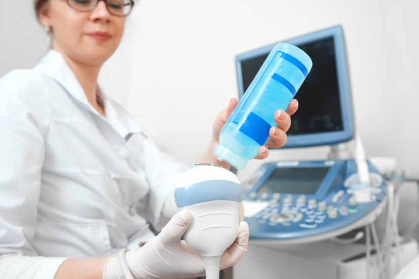 Pe suprafața pielii, medicul aplică un strat subțire de gel transparent. Acest gel are rolul de a facilita transmiterea undelor sonore și de a elimina eventualele bule de aer dintre sondă și piele, asigurând astfel obținerea unor imagini clare.