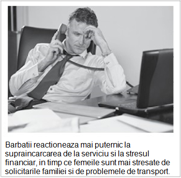 Pe de alta parte, barbatii declara mai adesea ca sunt supusi stresului financiar decat femeile, ceea ce este logic din moment ce exista asteptarea traditionala ca barbatii sa fie cei care asigura veniturile. Un alt studiu a cerut unui numar de 166 de cupluri casatorite sa tina un jurnal zilnic in care sa urmareasca 21 de factori de stres comuni, precum certurile si supraincarcarea acasa si la serviciu pentru o perioada de sase saptamani. Barbatii au reactionat mai puternic la grjile financiare, supraincarcarea la serviciu sau o cearta cu un copil, de exemplu, in timp ce femeile au fost mai afectate de certurile cu sotul, dificultati de transport sau solicitarile din partea familiei. Unele cercetari interesante sugereaza, de asemenea, faptul ca femeile si barbatii tind sa faca fata situatiilor stresante in moduri diferite. O echipa de psihologi de la UCLA a publicat un studiu in Psychological Review, care a constatat ca este mai putin probabil ca femeile sa lupte sau sa fuga atunci cand sunt confruntate cu factori de stres. In schimb, este mai probabil „sa ingrijeasca si sa se imprieteneasca”.