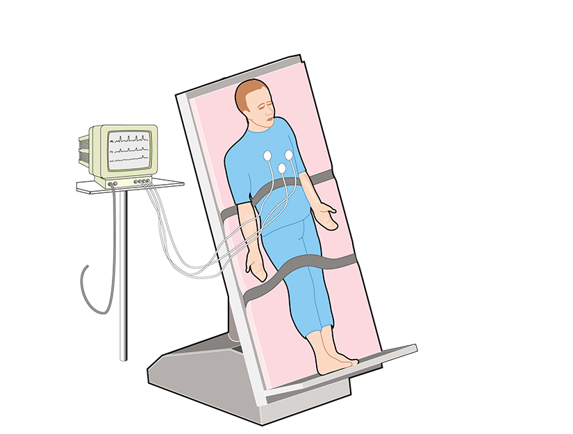 • Dupa aproximativ 5 minute, asistenta va inclina masa mai mult, la un unghi de 60 de grade sau mai mare. Asistenta va continua sa masoare tensiunea arteriala si ritmul cardiac timp de 45 de minute. Asistenta iti va cere sa ramai linistit in toata aceasta perioada, dar trebui sa ii spui daca te simti inconfortabil.