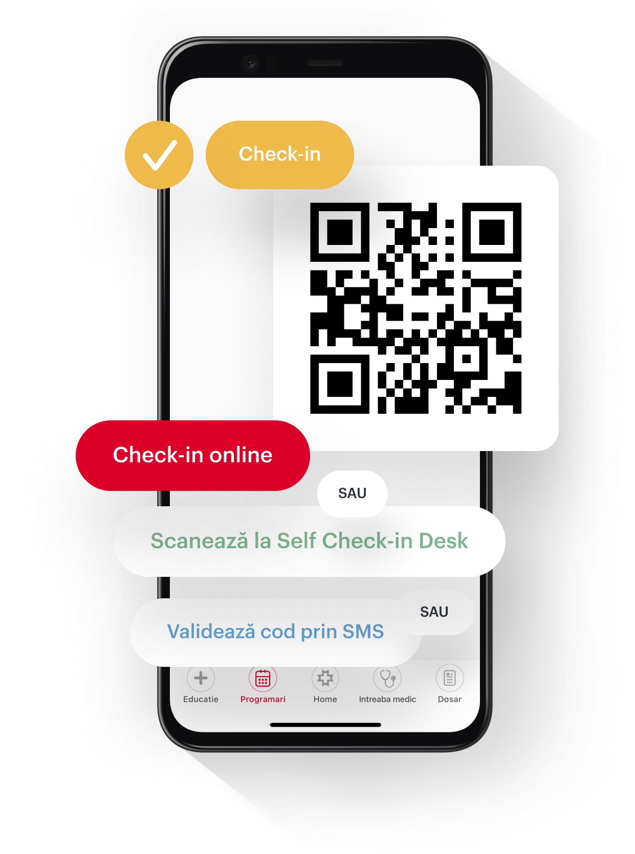 Fara sa mai treci pe la receptie. Intra in “Programari” si apasa “check-in” pentru a afla rapid etajul si cabinetul.