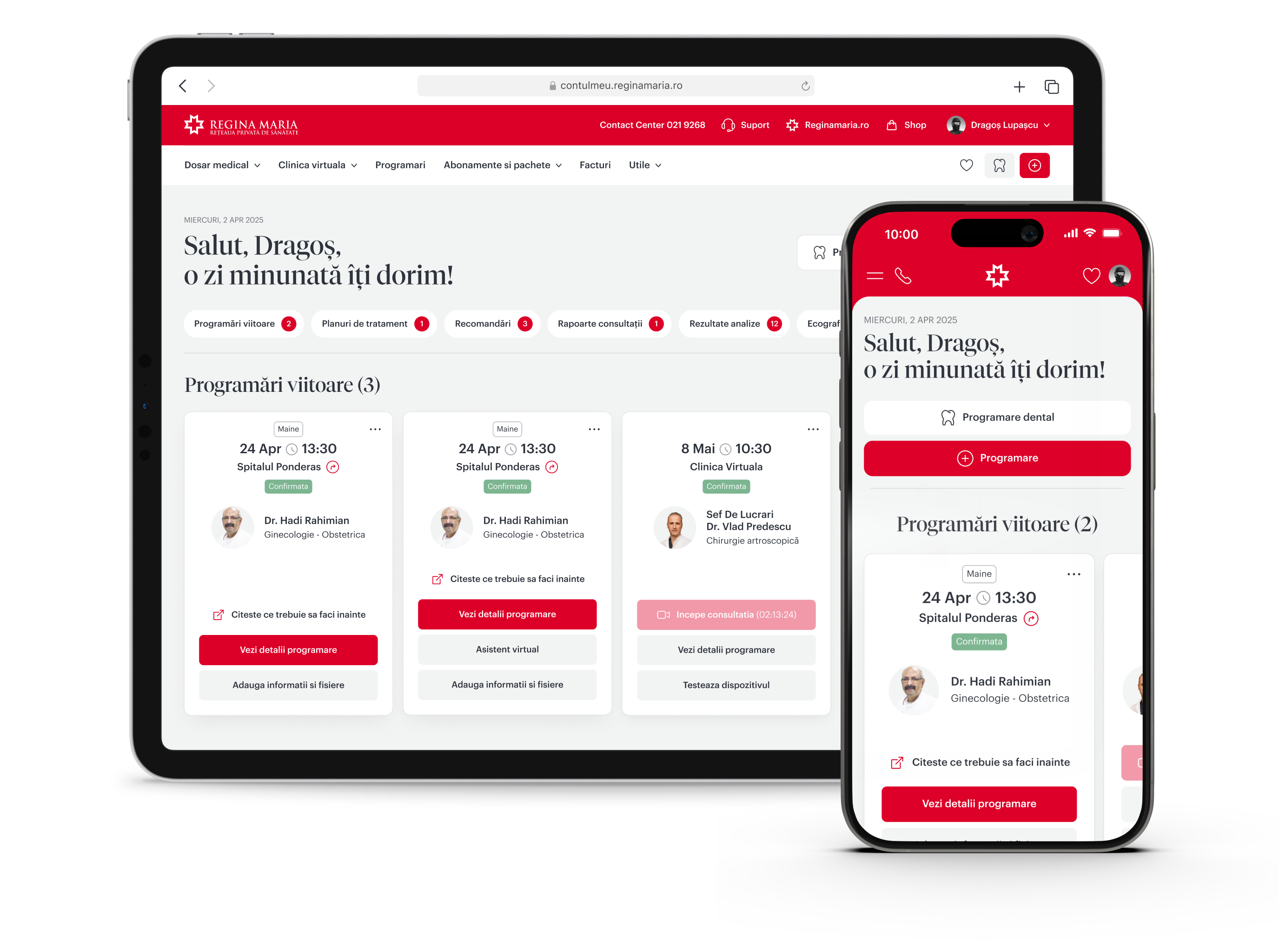 Vei putea accesa oricând detaliile consultațiilor, investigațiilor și analizelor, atâta timp cât nu renunți la contul tău. Aceleași informații sunt disponibile în aplicația Contul meu REGINA MARIA și pe https://contulmeu.reginamaria.ro/.