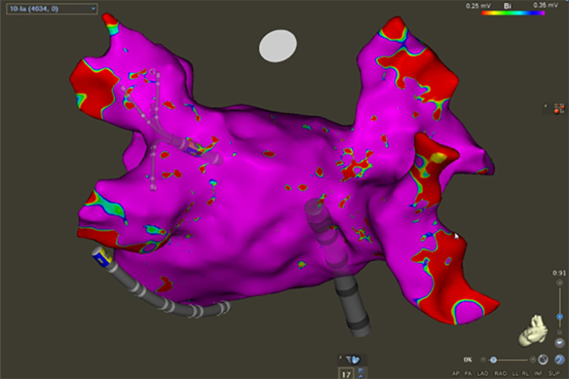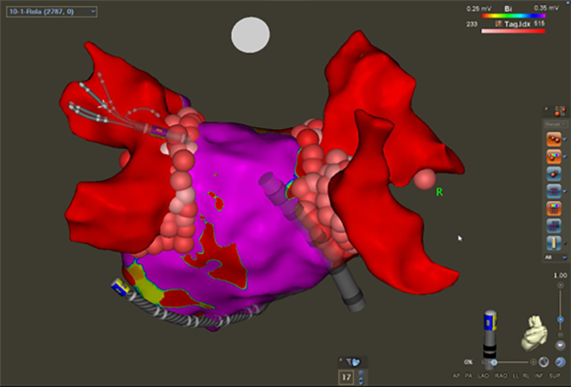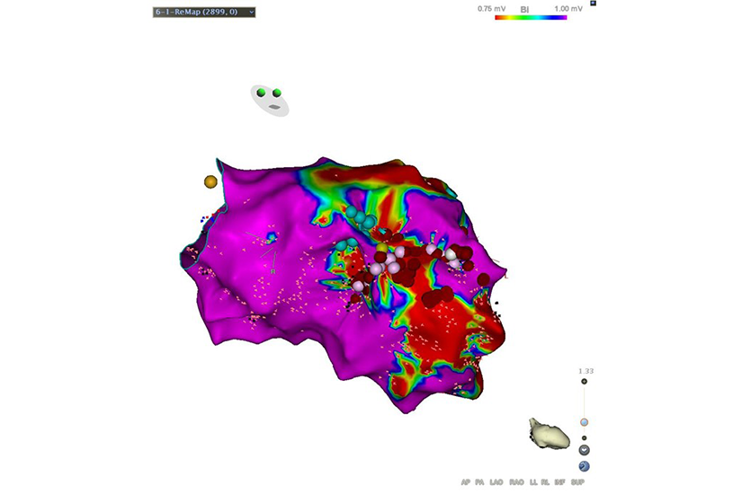 Imaginea de mai sus reprezinta o harta electrica a ventricului stang apartinand unui pacient cu infarct miocardic in antecedent. Infarctul – tesutul necrozat – este reprezentat in culoare rosie, iar partea de tesut sanatos este de culoare purpurie. O procedura de ablatie de tahicardie ventriculara a fost efectuata cu rezolutia completa a aritmiei. Punctele de culoare rosie inchis reprezinta leziunile de ablatie care au intrerupt tahicardia permanent.
