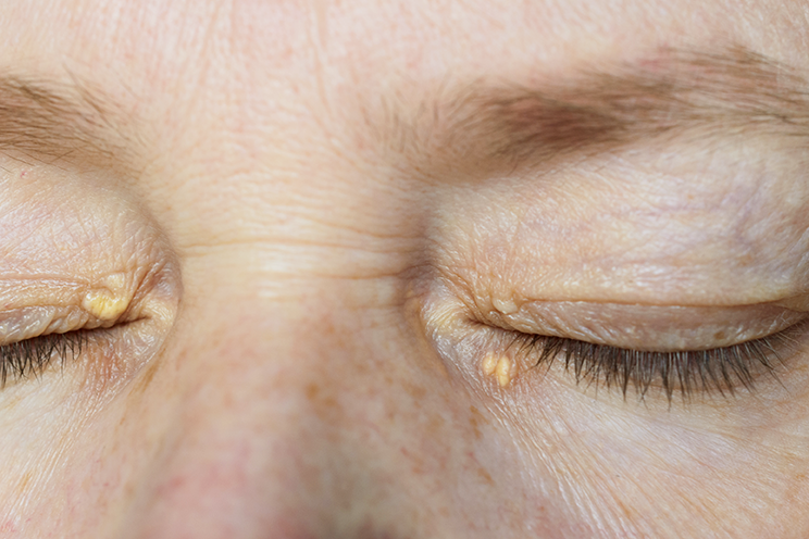 Xantelasma sunt depozite de grăsime galbenă în jurul ochilor, mai ales pe pleoape. Pot apărea chiar și la persoane cu colesterol moderat crescut și sunt mai frecvente la femei.